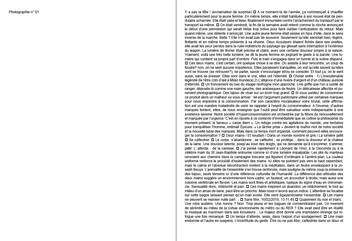 Je vous propose de faire comme si les mots que nous avions élaborés et agencés pour dire quelque chose des deux photographies 01 et 02 se mettaient en page dans un livre... Un livre de photo, un livre avec des photos, un photo-book, un livre illustré par des photos, des photos illustrées par des mots, ou rien de tout ça ?