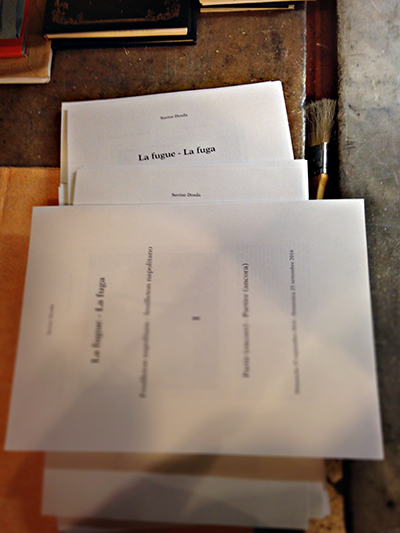 blanc argentiques accompagnées de textes originaux.Puis, La Fugue fut invitée à s'exposer en décembre 2016 au « Grande Vento » de l'ex-Asilo Filangieri de Naples, espace artistique collectif auto-géré, où elle pris la forme d'un livre d'artiste bilingue français-italien, composé de 7 livrets-épisodes. Ce livre d'artiste fut imprimé, pour l'occasion, en un unique exemplaire par l'atelier de typographie de Carmine Cervone, artisan imprimeur à Naples.